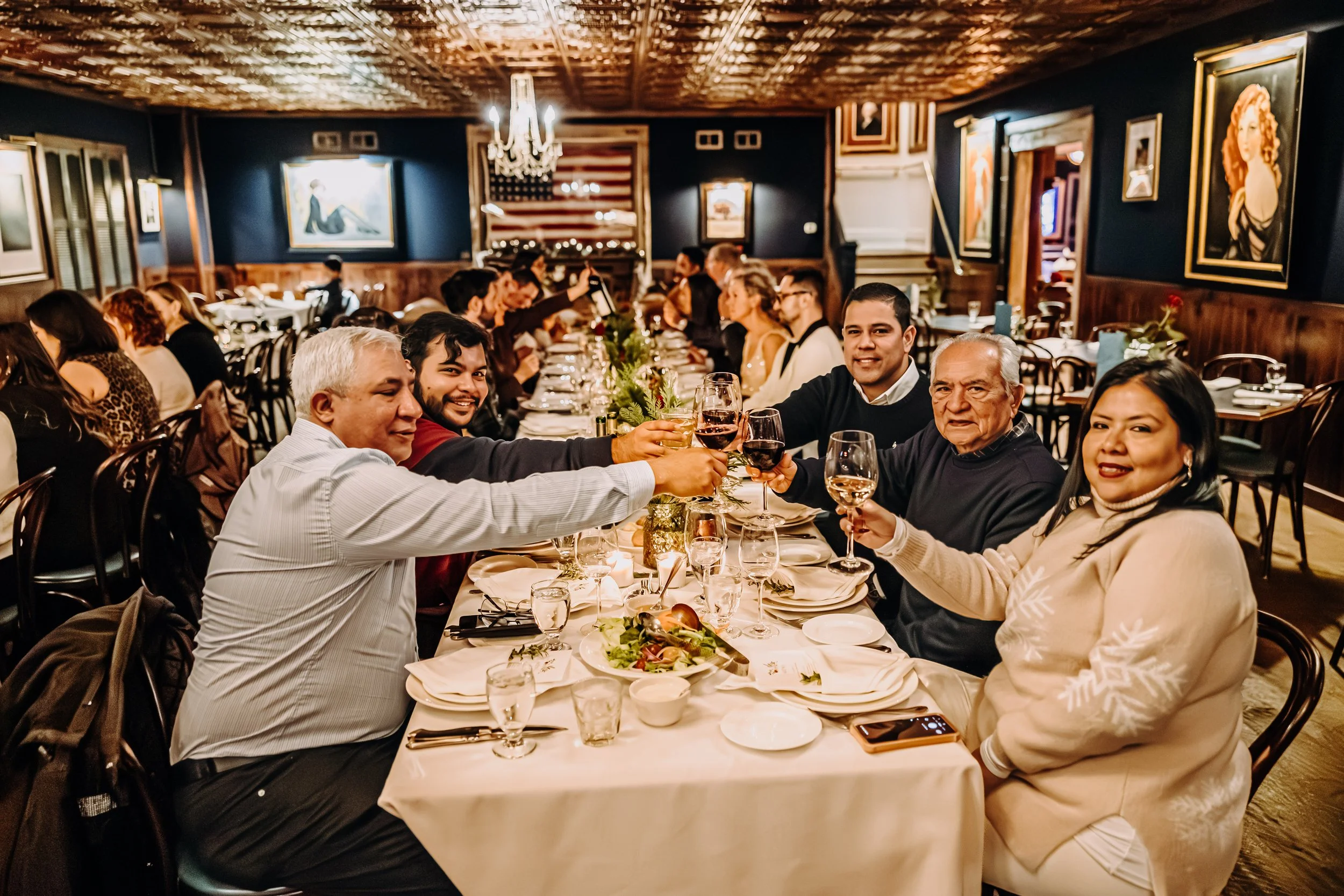 Under the intricate gleam of pressed metal ceilings and the wistful gaze of century-old paintings, our dining room offers a seat at the table of history. A partial buyout invites up to 80 guests to gather around long tables draped in crisp white linens, all anchored by the steady warmth of the grand fireplace. It is a space where the 1920s never quite ended: a resonant stage for the celebrations of today.
